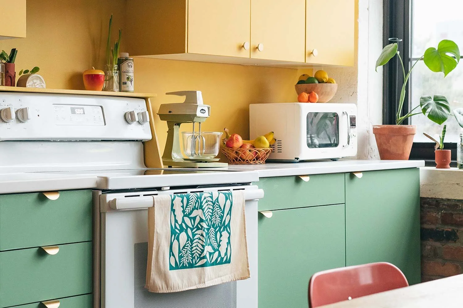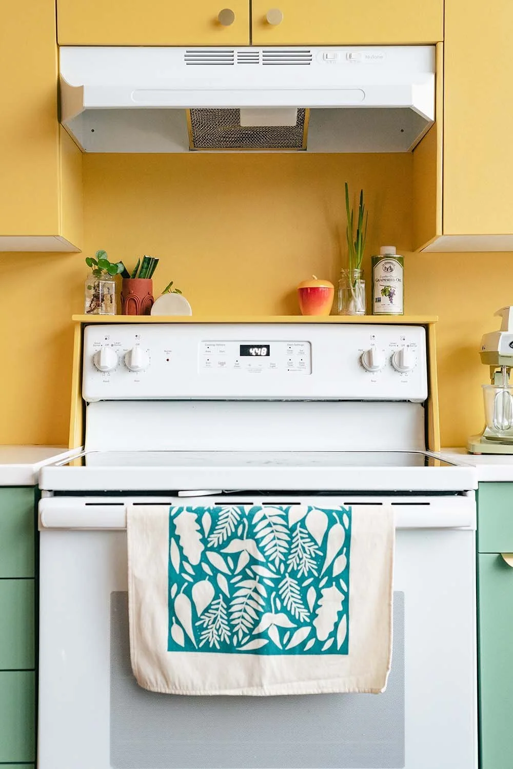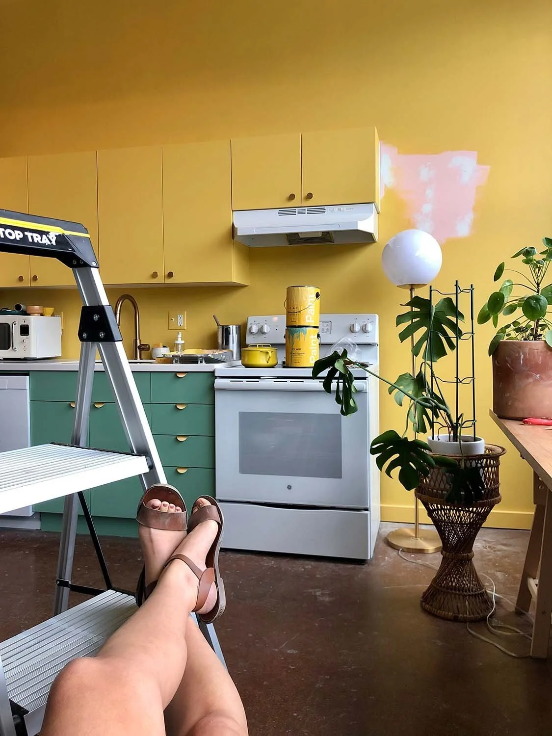 If this kitchen makeover was a middle school group project, the paint would be the person doing most of the work. Both of the main colors come from the brand Clare: the yellow is Golden Hour and the green is OMGreen. I love their curated selection of colors (really helps with the dreaded creative choice paralysis), but the only downside is that they currently only sell 1-gallon buckets, which is how I ended up with leftover paint from my mural.