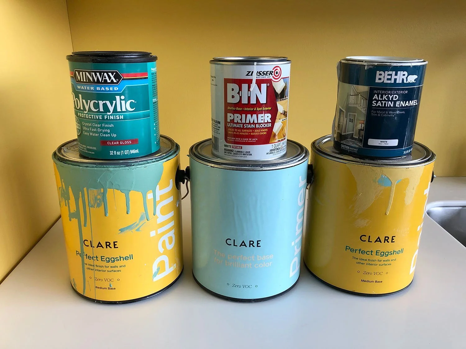 All of the paints I used to makeover my kitchen. Top row from L to R: Minwax Polycrylic Clear Gloss Water-based Polyurethane, B-I-N Shellac-Based White Interior Primer and Sealer, BEHR White Semi-Gloss Enamel Urethane Alkyd Enamel. Bottom row from L to R: Clare Interior Paint in OMGreen, Clare Interior Primer, Clare Interior Paint in Golden Hour