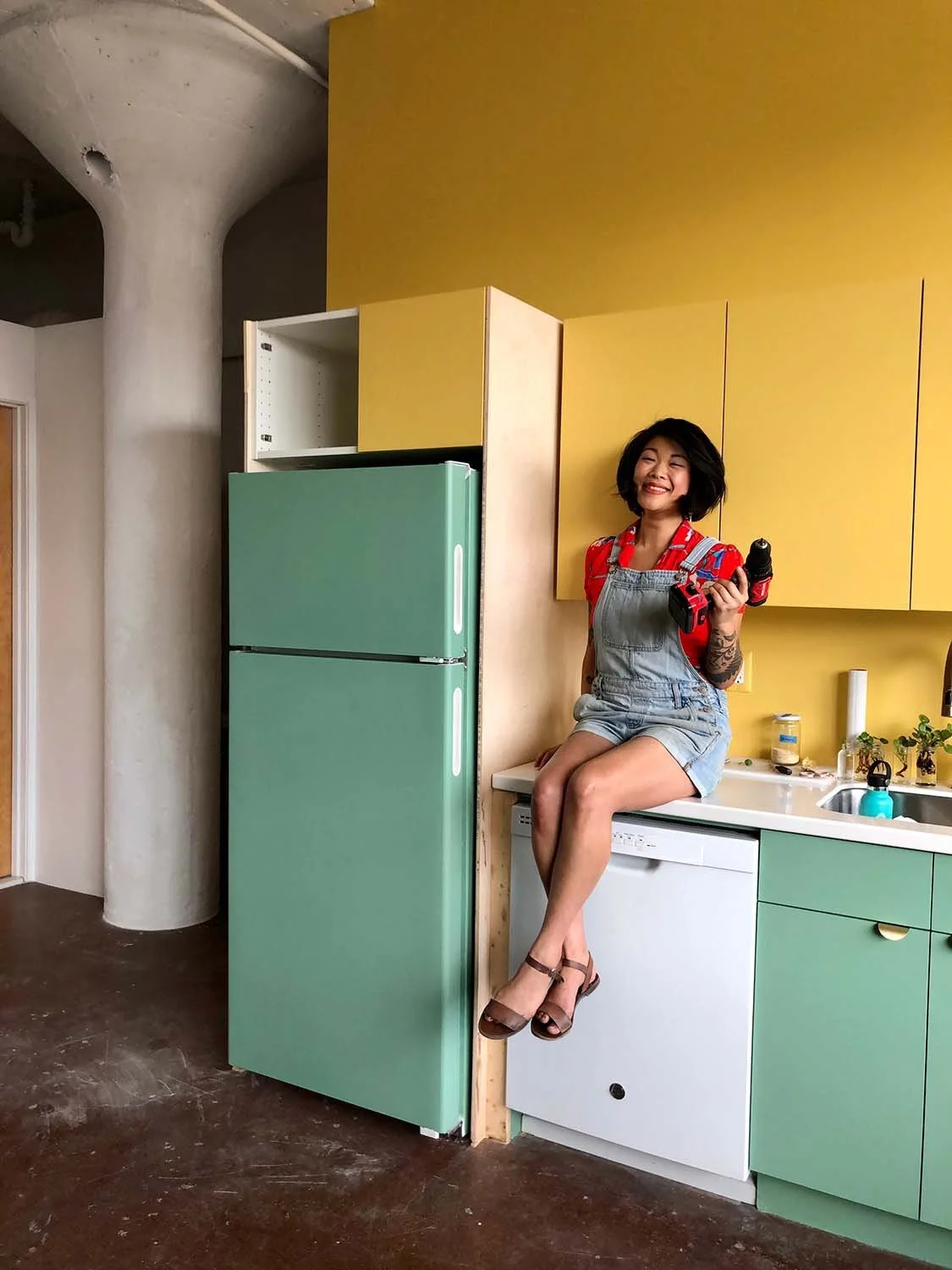 I built the cabinet surrounding the refrigerator with the help of this tutorial and another IKEA cabinet. It’s essentially a cabinet sandwiched between vertical two 1” plywood panels that I had cut down to size at my local Lowe’s. I mounted the structure to the wall and the side of the existing cabinets, which not only made it more secure but also feel built-in with the rest of the kitchen.