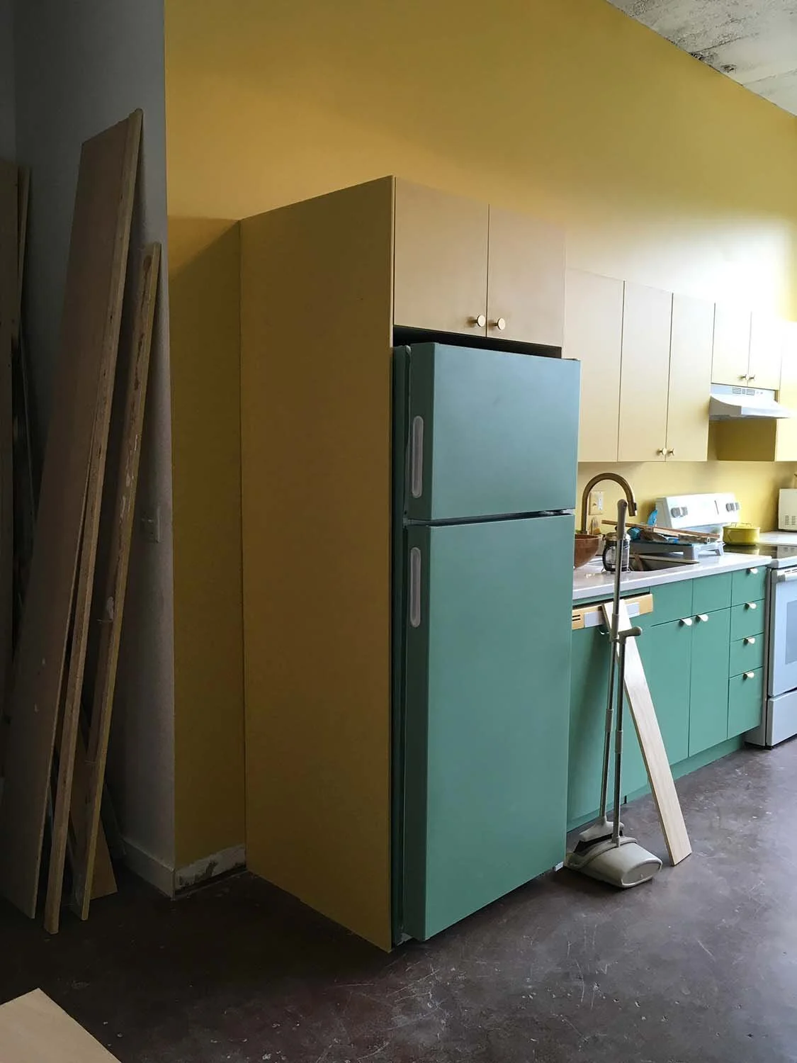 Moving the refrigerator to the other end of the single-wall kitchen turned out to be the key to unlocking it’s storage potential (not to mention letting more light into the room). Luckily, the original cabinets and doors, though sparse, were standard sizes and in pretty good shape, which gave me something to work off of.