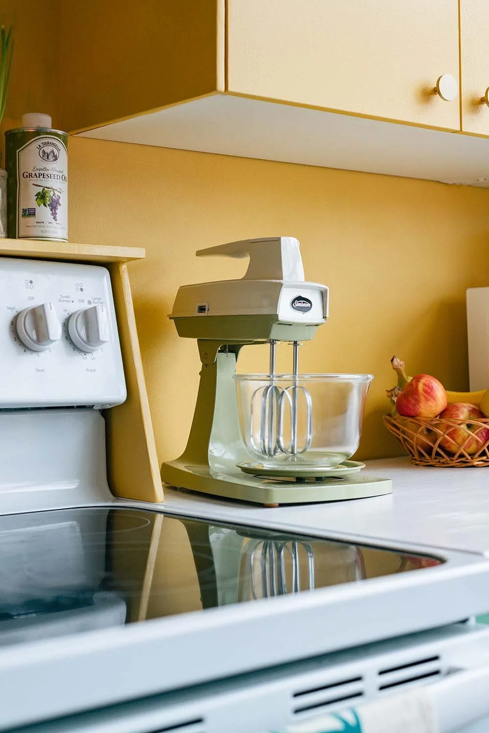 To balance out the modern look of the flat panel cabinet doors and solid, bright colors, I styled the kitchen with an eclectic mix of furniture and materials. Many of these items were sourced from vintage sellers and second-hand shops, which is fun for me and good for the planet. The downside is that it’s hard to link to them for others to shop, so I’ve included links to similar items if you like anything in my space.