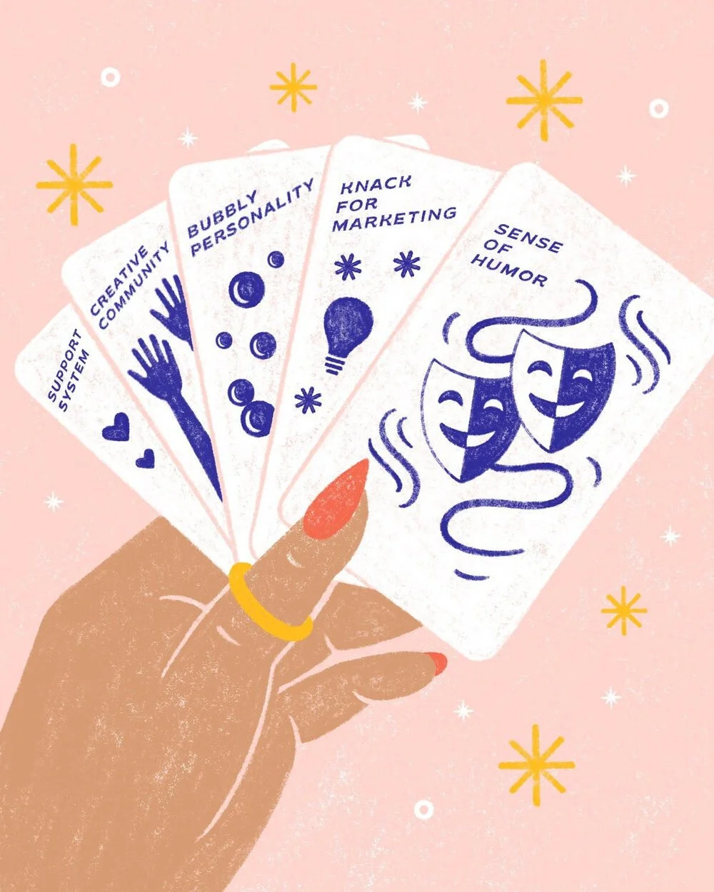 Thought starters: Try to think broadly. Your cards could include physical resources like money, space, or supplies. They could include intangible things like resilience, or grit, or a Skillshare membership. You could also think of intangibles in terms of particular talents or skill sets like being really good at analogies haha