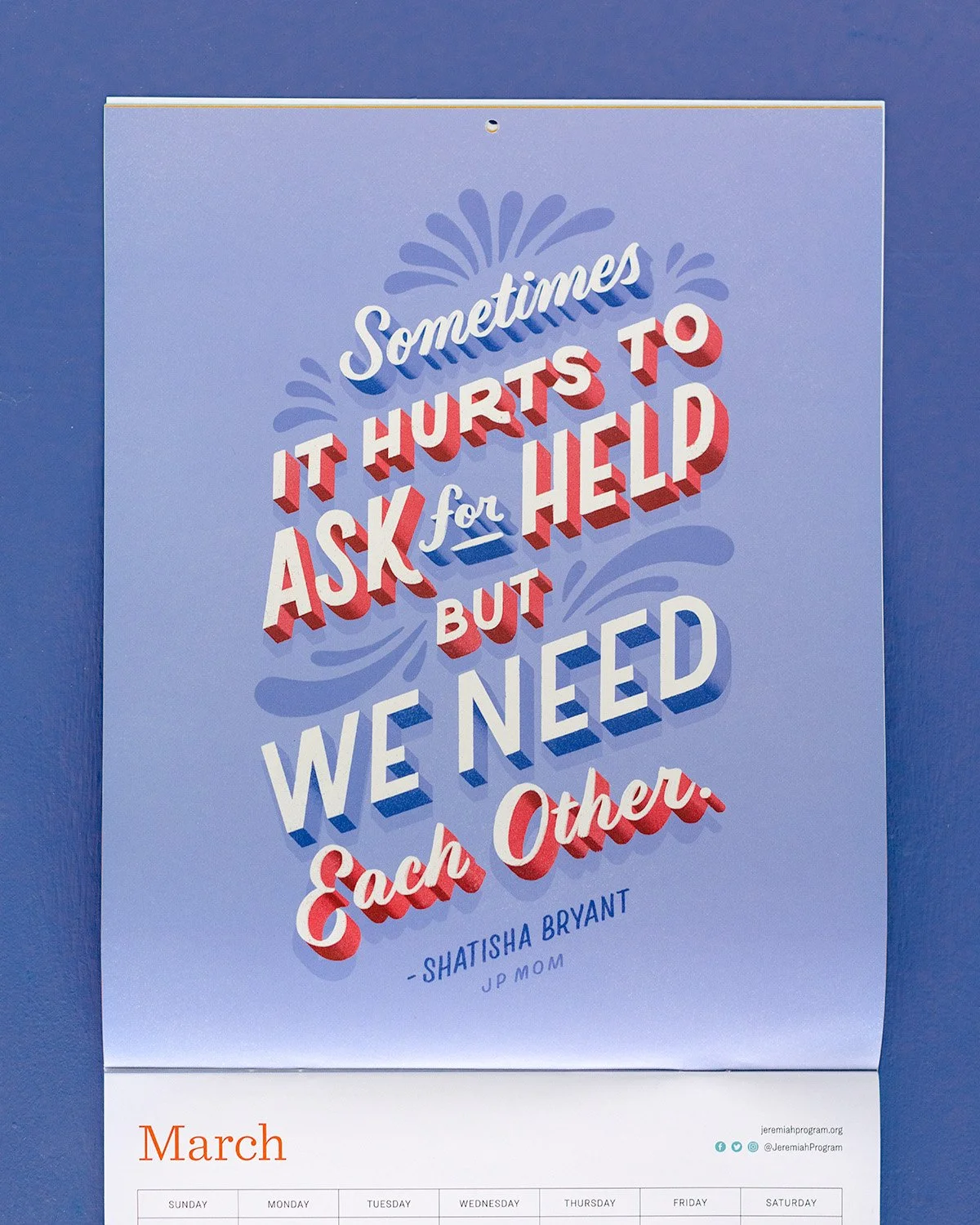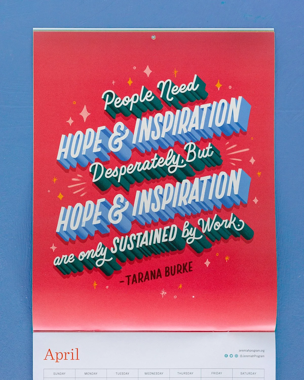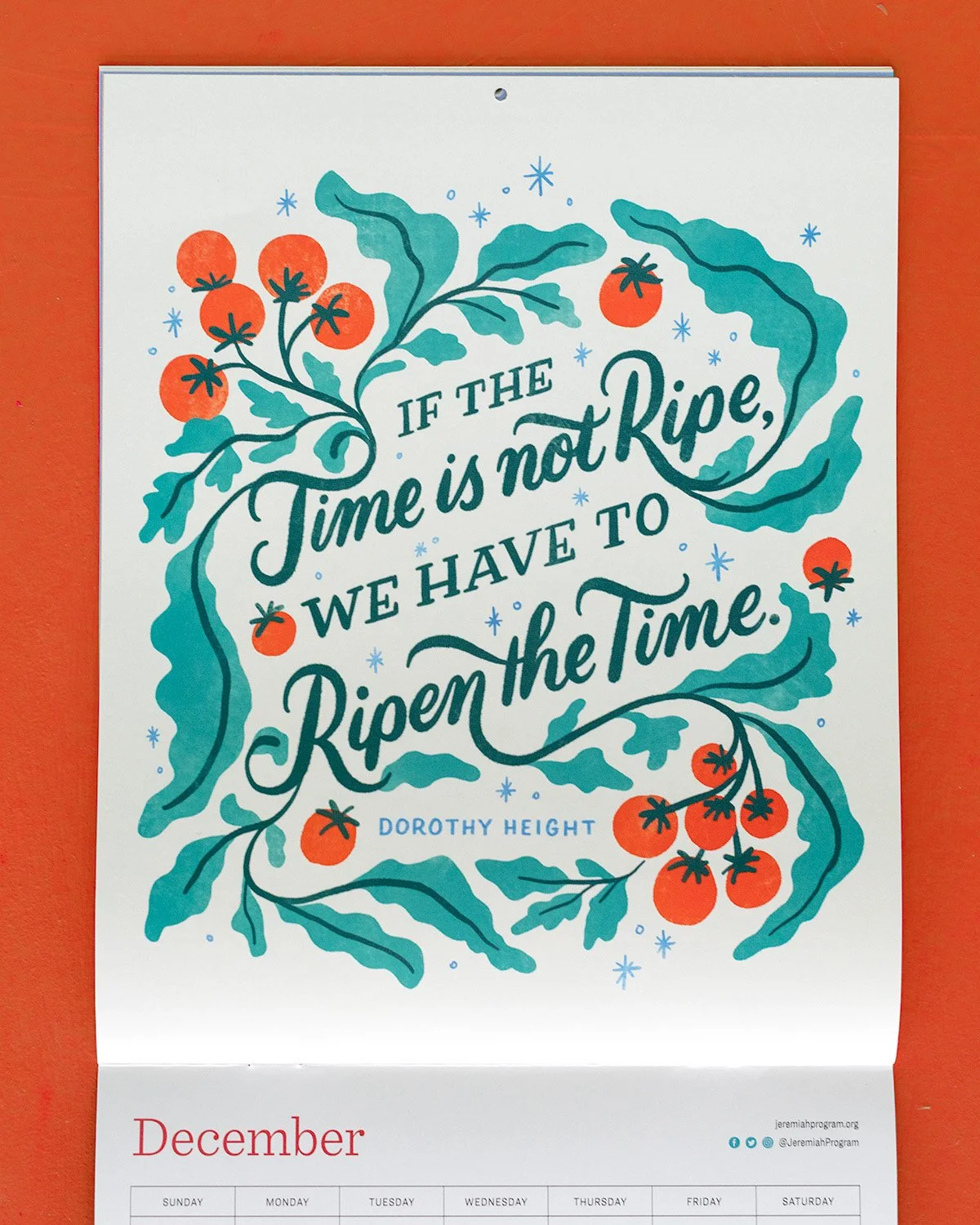 The Jeremiah Program commissioned a series of hand-lettered quotes from influential women and members for their 2025 calendar. The program is “a national organization with a mission to disrupt the cycle of poverty for single mothers and their children, two generations at a time.” Read more at jeremiahprogram.org.