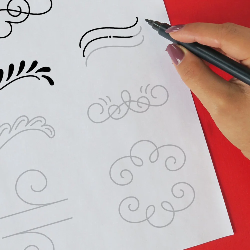 Practice your flourishes by tracing over 30+ of mine! Print them out and trace with a marker, or upload them to your iPad and trace them in your favorite drawing app.